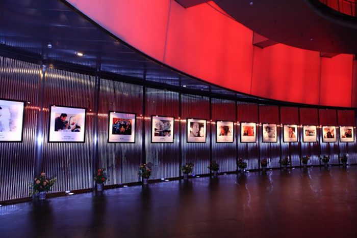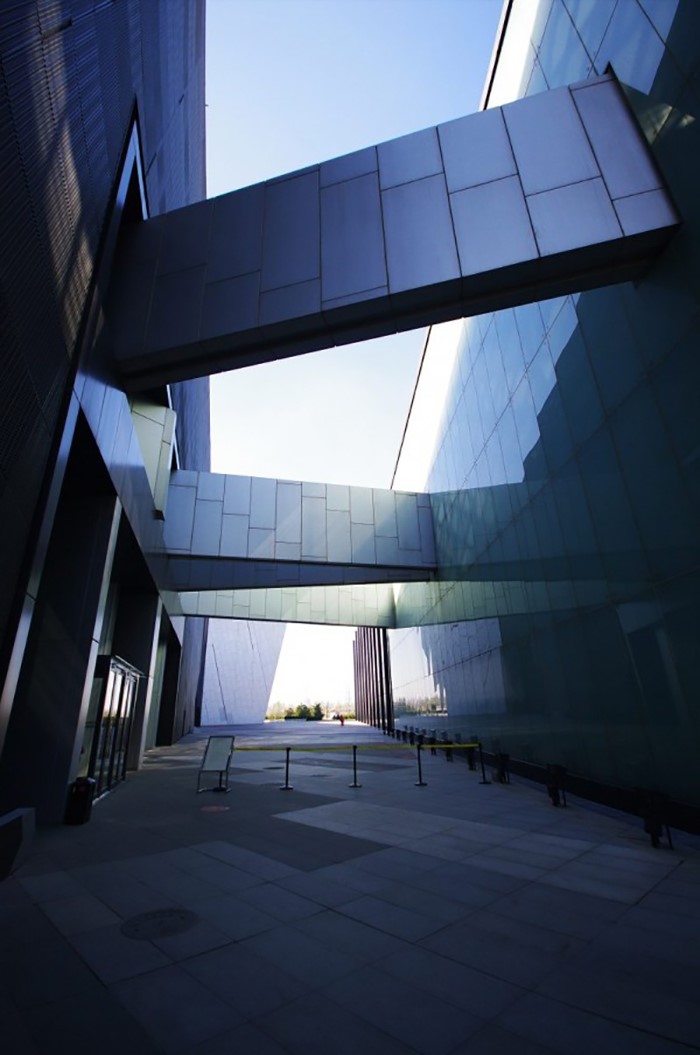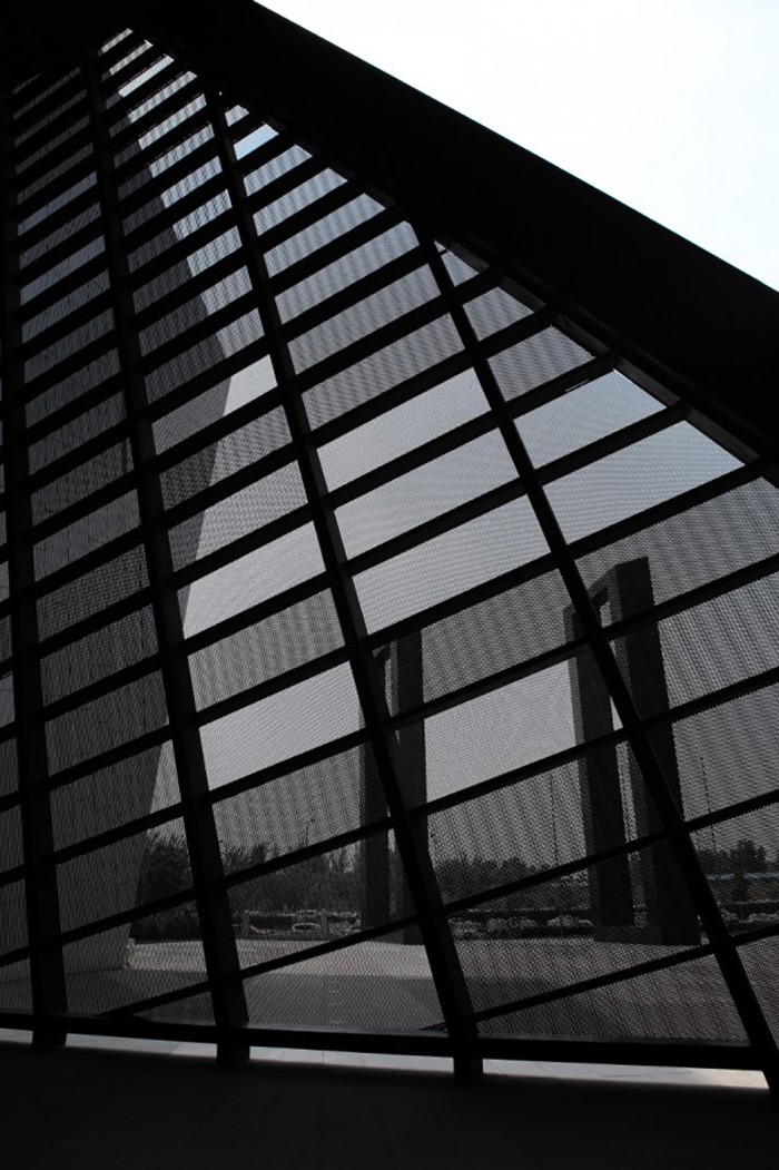 中國電影博物館的建筑外觀不僅氣勢(shì)宏偉,而且充滿了獨(dú)特的藝術(shù)特色。在主體建筑的前方,巨大的銀幕與廣場(chǎng)上一道斷續(xù)的斜墻構(gòu)成了形如咔打板的平面組合。建筑采用黑色作為基礎(chǔ)色,并使用鏤空?qǐng)D案的金屬板作為外層裝飾,為這座光影的殿堂蒙上了神秘的面紗。在統(tǒng)一、中性的黑色背景上,四個(gè)立面根據(jù)建筑的內(nèi)部公共空間的位置分別開辟一片大型彩色玻璃面。紅、綠、藍(lán)、黃分別代表的展覽、博覽、影院、綜合服務(wù)四個(gè)中國電影博物館大廳功能區(qū)域流露出多彩的個(gè)性。