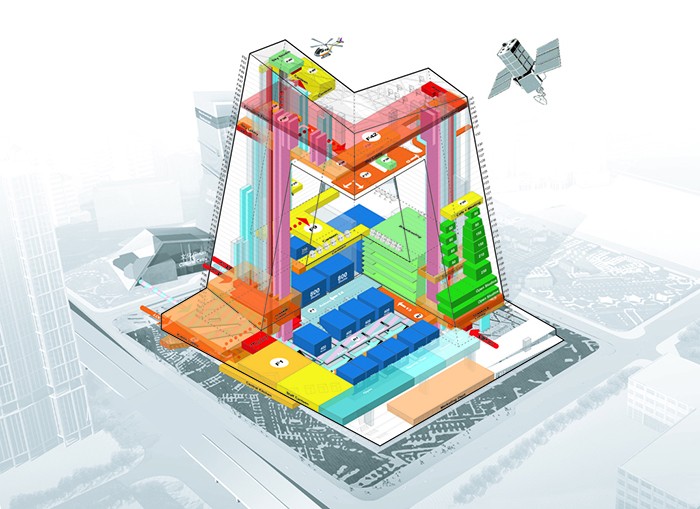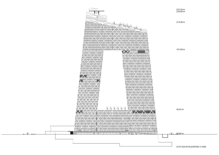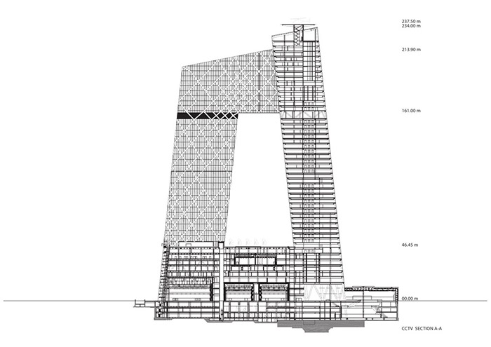 CCTV大樓的形式有助于將電視制作的整個(gè)工作流程組合在一個(gè)緊密相連的環(huán)路中。兩座塔樓從一個(gè)容納演了制作播室的共同基座上升起,并有所分工﹕塔樓壹是編輯和辦公區(qū),而較低的塔樓貳則主要服務(wù)于新聞制播。兩座塔樓由通過(guò)容納行政管理區(qū)的空中之橋——懸臂連接在一起。