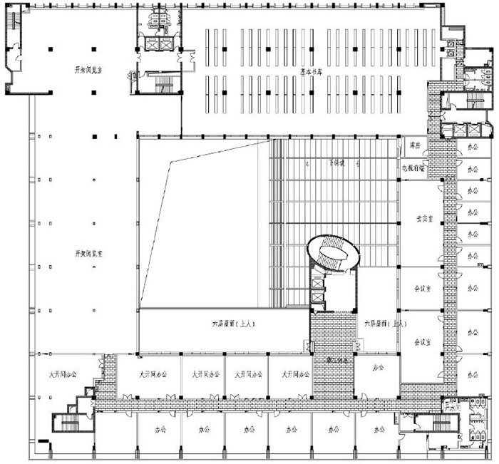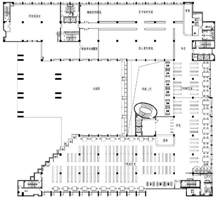 建筑整體圍繞著一個向西南開放的內(nèi)院展開,內(nèi)院的邏輯源于對傳統(tǒng)四合院背后意義的新解釋,它帶給建筑能量:陽光、空氣、景觀,這便是方案所追求的新模式:集中式的便捷,分散式的環(huán)境優(yōu)雅,被融匯在一個理性的平面中,從而確保閱覽空間的采光通風。