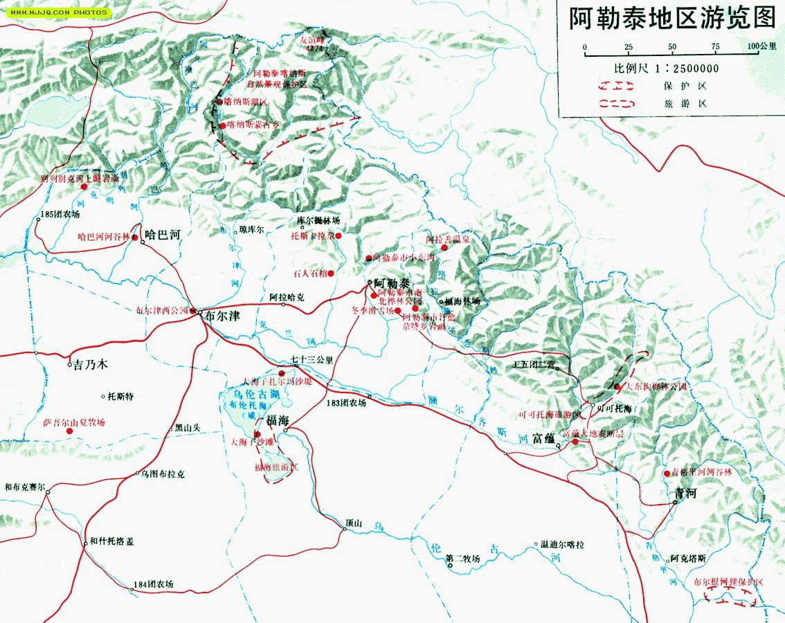 阿勒泰地區(qū)有高山森林、河谷風(fēng)光、湖泊溫泉、巖畫石刻等旅游資源數(shù)量為185處。這里有美麗的喀納斯湖風(fēng)景區(qū)、布爾根河河貍自然保護(hù)區(qū)、福海海濱風(fēng)景區(qū)、蝴蝶溝、烏倫古湖海濱浴場、白沙湖、鳴沙山,以及高山風(fēng)光、冰川雪嶺、湖泊溫泉、巖畫石刻,切木爾切克古墓群及草原石人阿勒泰市四面環(huán)山,地形奇異。