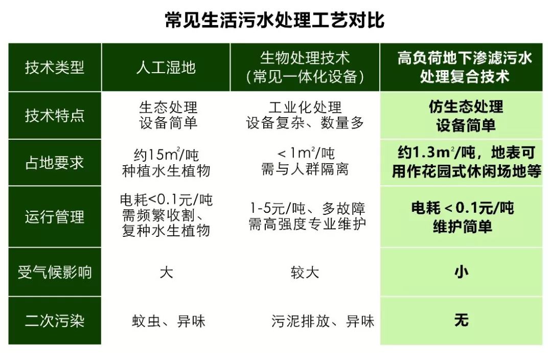 “高負(fù)荷地下滲濾技術(shù)”作為仿生態(tài)技術(shù),在保留了“傳統(tǒng)地下滲濾”傳統(tǒng)地下滲濾主要優(yōu)點的同時,克服了生化處理技術(shù)設(shè)備多、能耗高、需要專業(yè)維護(hù)等主要缺點;同時又解決了生態(tài)處理技術(shù)占地面積大,冬季無法正常運行的重大缺陷。